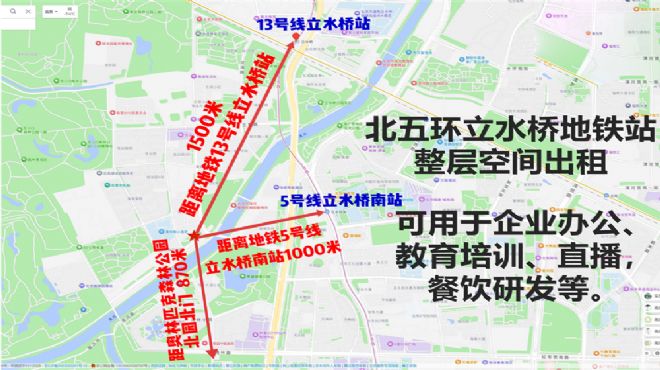 出租面积 :785㎡出租价格:1.6元/㎡/天(含物业费)院内配套 :有停车位周边环境 :奥林匹克森林公园、嘉铭奥森产业园、林奥购物中心、上品购物中心。交 通 :距地铁5号线立水桥南站1200米 ;距地铁13号线立水桥站1500米 。北五环立水桥地铁站附近整层空间出租,可用于企业办公、教育培训、直播,餐饮研发等。联 系 人:谢先生 联系电话:400-108-0038