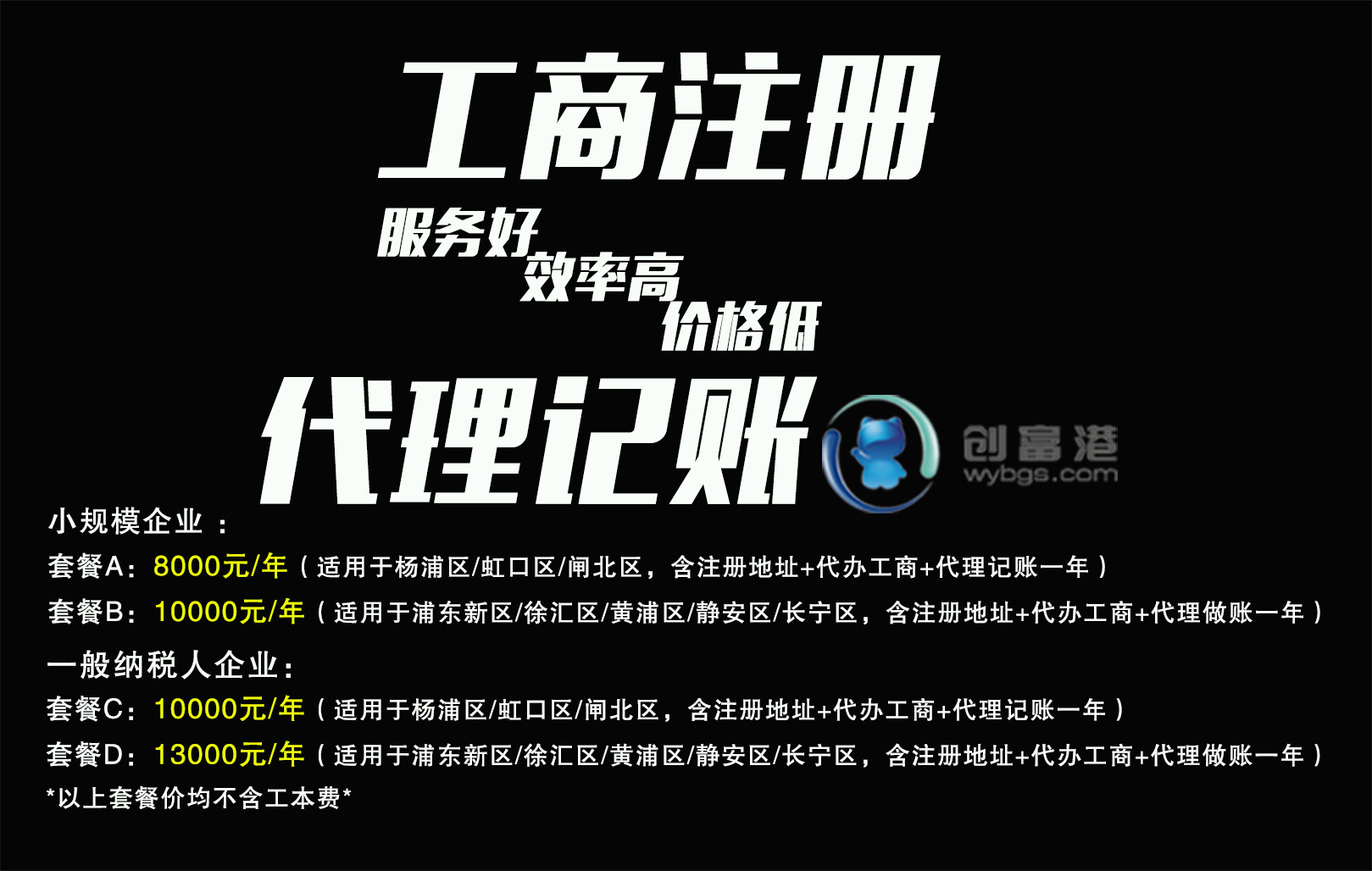 我们的优势: 办公室多:新店开业,房间数量多,类型多,选择多、总能找到适合您的办公单间 环境典雅:位处长宁购物生活中心区,却闹中取静,装修精美,家具齐全。 交通便利:毗邻延安西路站、上下班方便长宁核心商圈消费购物更方便! 费用全包:物业费、水费、电费、网络费、清洁费、空调费不用付,省下就是赚下!24小时办公! 配套完善:休闲区、会议室、洽谈间、前台接待、电话秘书、收件传真、打印复印扫描、行政管理应有尽有! 全包实惠便宜省心省力省时 1500~6000/月,1-10人办公,全包水(饮用水)、电(空调)、物业、光纤宽、带收发快递(传真)、办公家具、电话、免费会议室、茶水、冰箱、微波炉、日常保洁、日常维护、前台秘书服务、办公维护、网络维护等等。一条龙服务:办公室租赁、注册(实地注册)、*记账,省心省力。 想更省钱可选择创富港的虚拟办公 180元/月:商业地址、代收信件、传真、客户接待 280元/月:代接电话、客户接待 100元/时:十人会议室使用 6500元/年:注册公司 3200元/年:申请一般纳税人,一般纳税人看场地 300元/月起:代理记账.财税代理 特别提供杨浦虹口注册优惠打包价6000元/年名额有限(含注册地址+代理记账+代办注册)。浦东、徐汇可虚拟注册地址6000元/年起,闵行、松江可注册虚拟注册地址4000元/年起,可注册内外资公司办理食品流通许可证等,特办自贸区公司注册10000元起(注册地址+三证代办),医疗器械、食品流通、酒类等均可办理 联系人:郑小姐电话:138-1774-6575 公司微信号:cfgshbgs